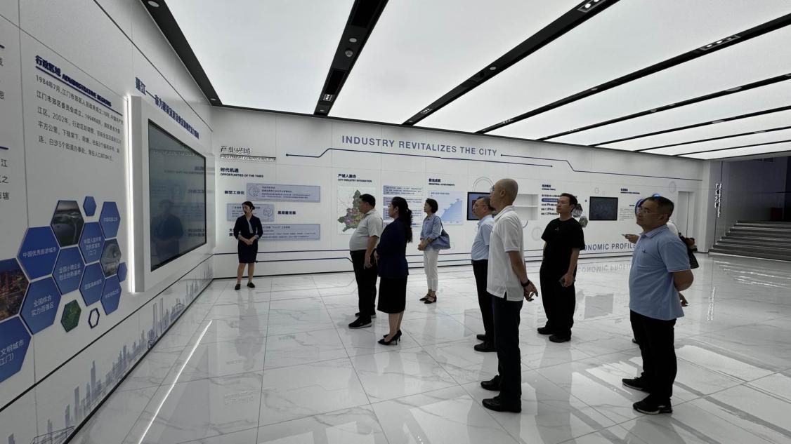 在蓬江產(chǎn)業(yè)會客廳,調(diào)研組通過豐富的展陳板塊和宣傳影片,系統(tǒng)了解了江門市及蓬江區(qū)經(jīng)濟社會發(fā)展成就、區(qū)域優(yōu)勢、投資環(huán)境、 營商政策以及“3+2”產(chǎn)業(yè)鏈和戰(zhàn)略性產(chǎn)業(yè)集群布局,直觀感受了蓬江區(qū)的區(qū)位交通優(yōu)勢和城市風(fēng)貌。
