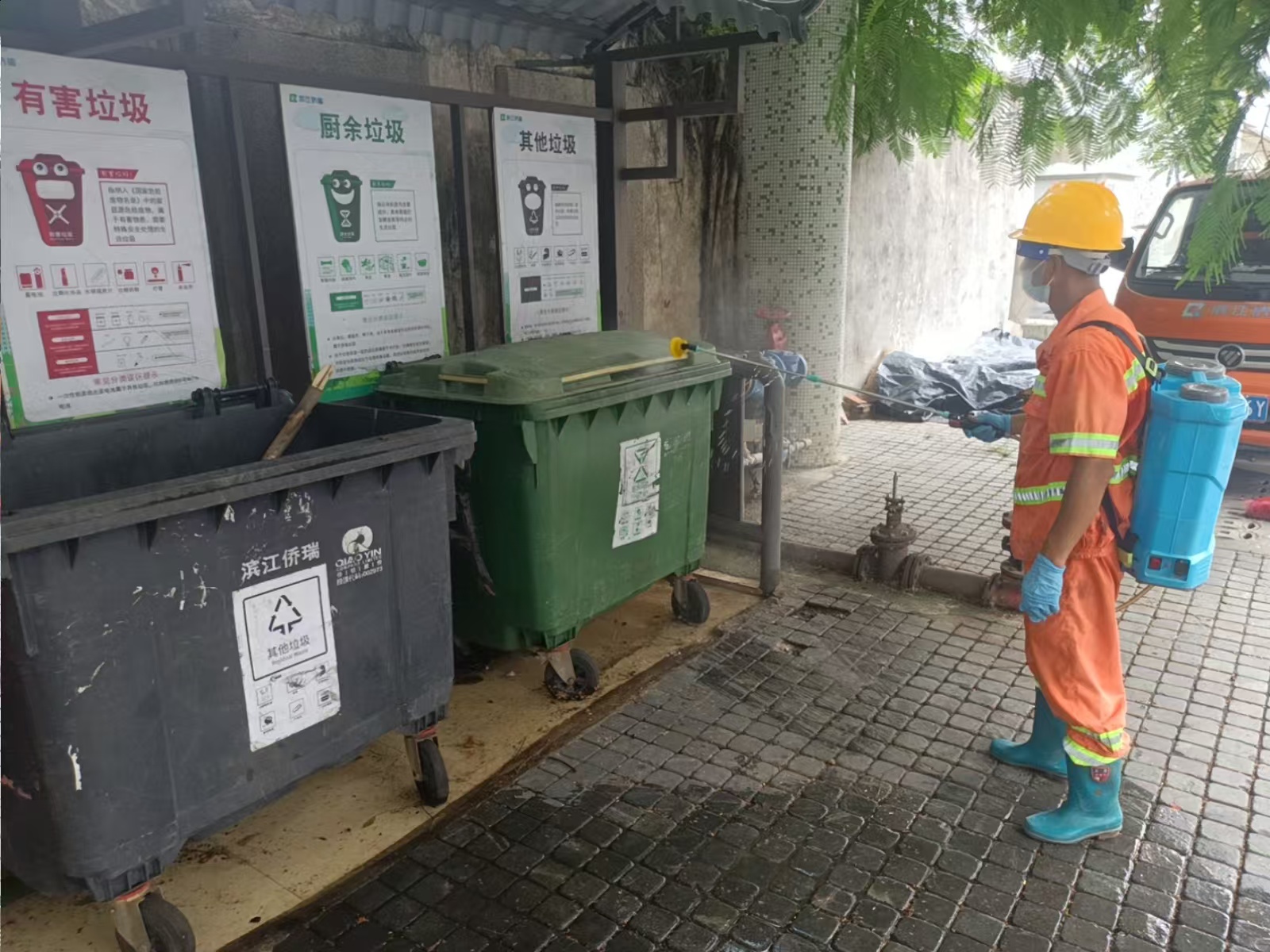△環(huán)衛(wèi)工作人員對垃圾桶、垃圾轉(zhuǎn)運站等地方開展消殺作業(yè)