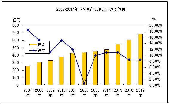 初步核算,2017年全區(qū)實現(xiàn)地區(qū)生產(chǎn)總值(GDP)685.55億元,同比增長8.5%。分產(chǎn)業(yè)看,第一產(chǎn)業(yè)增加值7.08億元,同比下降2.3%;第二產(chǎn)業(yè)增加值317.1億元,同比增長8.4%;第三產(chǎn)業(yè)增加值361.36億元,同比增長8.8%。在第三產(chǎn)業(yè)增加值中,交通運輸、倉儲和郵政業(yè)增長5.3%,批發(fā)和零售業(yè)增長5.6%,金融業(yè)增長2.4%,其他服務(wù)業(yè)的營利性服務(wù)業(yè)增長22.7%,房地產(chǎn)業(yè)下降2.3%。三次產(chǎn)業(yè)結(jié)構(gòu)為1:46.3:52.7。人均地區(qū)生產(chǎn)總值91859元,同比增長7.4%。