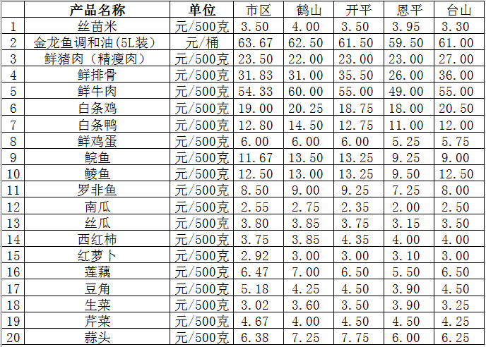 說(shuō)明:1、表中價(jià)格為該地區(qū)監(jiān)測(cè)點(diǎn)綜合平均價(jià);2、“市區(qū)”含蓬江區(qū)、江海區(qū)、新會(huì)區(qū),價(jià)格分別采自蓬江市場(chǎng)、江南市場(chǎng)、城東市場(chǎng)等6家農(nóng)貿(mào)市場(chǎng);3、其他四個(gè)縣市價(jià)格分別采自新鶴市場(chǎng)、錦江市場(chǎng)等8家農(nóng)貿(mào)市場(chǎng)。