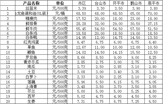 說明:1、表中價(jià)格為該地區(qū)監(jiān)測(cè)點(diǎn)綜合平均價(jià);2、“市區(qū)”含蓬江區(qū)、江海區(qū)、新會(huì)區(qū),價(jià)格分別采自蓬江市場(chǎng)、江南市場(chǎng)、城東市場(chǎng)等13家農(nóng)貿(mào)市場(chǎng);3、其他四個(gè)縣市價(jià)格分別采自新鶴市場(chǎng)、錦江市場(chǎng)等8家農(nóng)貿(mào)市場(chǎng)。