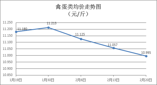 禽蛋類商品價格主降。本周所監(jiān)測的6種禽蛋類商品價格波動情況為1漲4跌1平,綜合零售均價為10.995元/斤,環(huán)比下降0.56%。其中:白條雞、白條鴨零售均價分別為每斤20.06元、15.43元,環(huán)比分別下降1.13%、上漲0.19%;白殼雞蛋、鴨蛋零售均價分別為每斤7.12元、7.83元,環(huán)比分別下降1.25%、下降0.25%。
