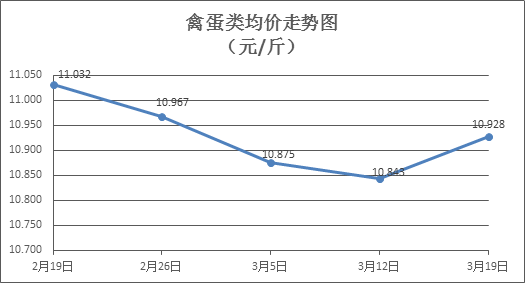 禽蛋類商品價格總體略升。本周所監(jiān)測的6種禽蛋類商品價格波動情況為5漲1跌,綜合零售均價為10.928元/斤,環(huán)比上漲0.78%。其中:白條雞、白條鴨零售均價分別為每斤19.72元、15.27元,環(huán)比分別上漲0.36%、上漲1.60%;白殼雞蛋、鴨蛋零售均價分別為每斤6.93元、7.84元,環(huán)比分別下降1.28%、上漲1.29%。