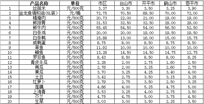 說明:1、表中價格為該地區(qū)監(jiān)測點綜合平均價;2、“市區(qū)”含蓬江區(qū)、江海區(qū)、新會區(qū),價格分別采自蓬江市場、江南市場、城東市場等13家農(nóng)貿(mào)市場;3、其他四個縣市價格分別采自新華市場、錦江市場等8家農(nóng)貿(mào)市場。