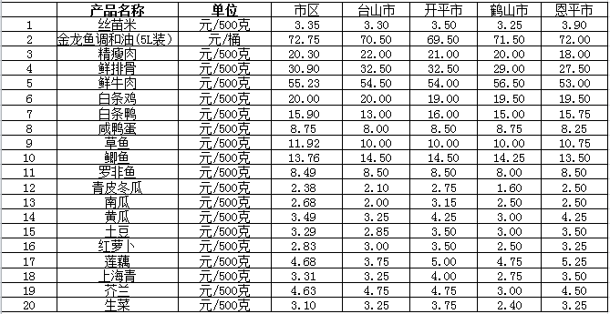 說明:1、表中價格為該地區(qū)監(jiān)測點綜合平均價;2、“市區(qū)”含蓬江區(qū)、江海區(qū)、新會區(qū),價格分別采自蓬江市場、江南市場、城東市場等13家農(nóng)貿(mào)市場;3、其他四個縣市價格分別采自新華市場、錦江市場等8家農(nóng)貿(mào)市場。