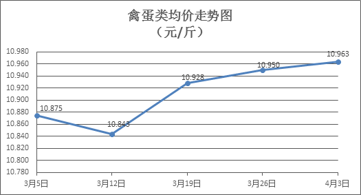 禽蛋類商品價格升降互現。本周所監(jiān)測的6種禽蛋類商品價格波動情況為3漲2跌1平,綜合零售均價為10.963元/斤,環(huán)比上漲0.12%。其中:白條雞、白條鴨零售均價分別為每斤19.77元、15.38元,環(huán)比分別上漲0.15%、上漲0.07%;白殼雞蛋、鴨蛋零售均價分別為每斤6.99元、7.82元,環(huán)比分別上漲1.16%、下降0.38%。