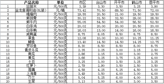 說明:1、表中價(jià)格為該地區(qū)監(jiān)測點(diǎn)綜合平均價(jià);2、“市區(qū)”含蓬江區(qū)、江海區(qū)、新會區(qū),價(jià)格分別采自蓬江市場、江南市場、城東市場等13家農(nóng)貿(mào)市場;3、其他四個(gè)縣市價(jià)格分別采自新華市場、錦江市場等8家農(nóng)貿(mào)市場。