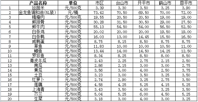 說明:1、表中價格為該地區(qū)監(jiān)測點綜合平均價;2、“市區(qū)”含蓬江區(qū)、江海區(qū)、新會區(qū),價格分別采自蓬江市場、江南市場、城東市場等13家農(nóng)貿(mào)市場;3、其他四個縣市價格分別采自新華市場、錦江市場等8家農(nóng)貿(mào)市場。