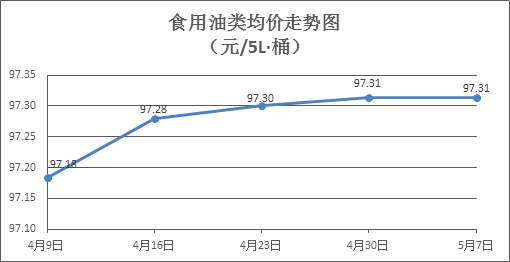 食用油類商品價(jià)格微幅調(diào)整。本周所監(jiān)測(cè)的9種食用油(5L裝)商品價(jià)格波動(dòng)情況為3漲2跌4平,綜合零售均價(jià)為97.31元/桶,環(huán)比持平。其中:金龍魚花生油、玉米油零售均價(jià)分別為每桶106.43元、76.21元,環(huán)比分別下降0.06%、上漲0.12%。