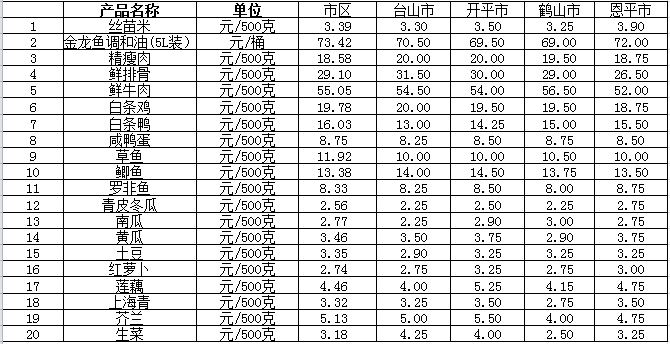說明:1、表中價(jià)格為該地區(qū)監(jiān)測(cè)點(diǎn)綜合平均價(jià);2、“市區(qū)”含蓬江區(qū)、江海區(qū)、新會(huì)區(qū),價(jià)格分別采自蓬江市場(chǎng)、江南市場(chǎng)、城東市場(chǎng)等13家農(nóng)貿(mào)市場(chǎng);3、其他四個(gè)縣市價(jià)格分別采自新華市場(chǎng)、錦江市場(chǎng)等8家農(nóng)貿(mào)市場(chǎng)。
