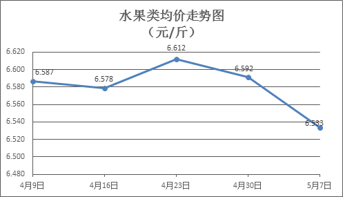 水果類商品價(jià)格穩(wěn)中有降。本周所監(jiān)測(cè)的6種水果商品價(jià)格波動(dòng)情況為1漲4跌1平,綜合零售均價(jià)為6.533元/斤,環(huán)比下降0.88%。其中蘋果、香蕉、葡萄零售均價(jià)分別為每斤7.30元、3.20元、13.17元,環(huán)比分別上漲0.14%、下降0.62%、下降1.35%。