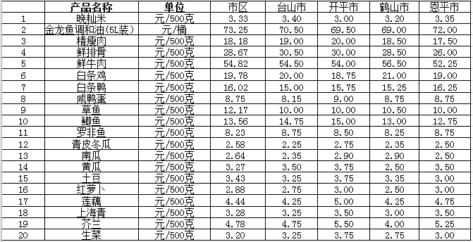 說明:1、表中價格為該地區(qū)監(jiān)測點(diǎn)綜合平均價;2、“市區(qū)”含蓬江區(qū)、江海區(qū)、新會區(qū),價格分別采自蓬江市場、江南市場、城東市場等13家農(nóng)貿(mào)市場;3、其他四個縣市價格分別采自新華市場、錦江市場等8家農(nóng)貿(mào)市場。