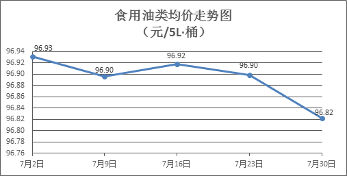 食用油類商品價(jià)格總體略降。上周所監(jiān)測(cè)的9種食用油(5L裝)商品價(jià)格波動(dòng)情況為1漲4跌4平,綜合零售均價(jià)為96.82元/桶,環(huán)比下降0.08%。其中:金龍魚(yú)花生油、金龍魚(yú)調(diào)和油零售均價(jià)分別為每桶105.41元、71.07元,環(huán)比分別下降0.27%、持平。
