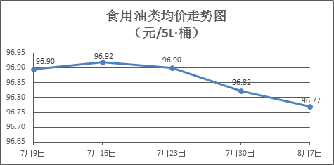 食用油類(lèi)商品價(jià)格總體略降。上周所監(jiān)測(cè)的9種食用油(5L裝)商品價(jià)格波動(dòng)情況為2漲5跌2平,綜合零售均價(jià)為96.77元/桶,環(huán)比下降0.05%。其中:金龍魚(yú)花生油、金龍魚(yú)調(diào)和油零售均價(jià)分別為每桶105.29元、71.07元,環(huán)比分別下降0.11%、持平。
