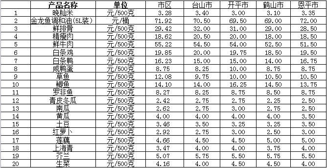 說明:1、表中價(jià)格為該地區(qū)監(jiān)測(cè)點(diǎn)綜合平均價(jià);2、“市區(qū)”含蓬江區(qū)、江海區(qū)、新會(huì)區(qū),價(jià)格分別采自蓬江市場(chǎng)、江南市場(chǎng)、城東市場(chǎng)等13家農(nóng)貿(mào)市場(chǎng);3、其他四個(gè)縣市價(jià)格分別采自新華市場(chǎng)、錦江市場(chǎng)等8家農(nóng)貿(mào)市場(chǎng)。