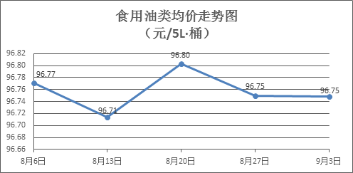 食用油類商品價(jià)格微幅波動(dòng)。上周所監(jiān)測(cè)的9種食用油(5L裝)商品價(jià)格波動(dòng)情況為3漲2跌4平,綜合零售均價(jià)為96.75元/桶,環(huán)比持平。其中:金龍魚花生油、金龍魚調(diào)和油零售均價(jià)分別為每桶104.65元、70.96元,環(huán)比分別上漲0.05%、持平。