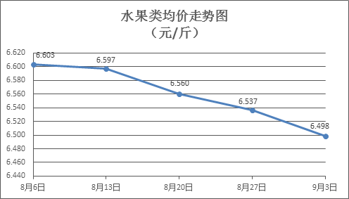水果類商品價(jià)格總體略降。上周所監(jiān)測(cè)的6種水果商品價(jià)格波動(dòng)情況為1漲3跌2平,綜合零售均價(jià)為6.498元/斤,下降0.59%。其中蘋果、香蕉、葡萄零售均價(jià)分別為每斤7.31元、3.06元、13.20元,環(huán)比分別下降0.95%、持平、下降1.12%。