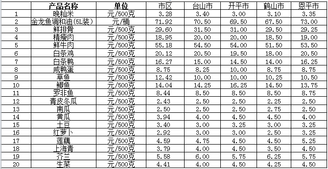 說明:1、表中價(jià)格為該地區(qū)監(jiān)測點(diǎn)綜合平均價(jià);2、“市區(qū)”含蓬江區(qū)、江海區(qū)、新會區(qū),價(jià)格分別采自蓬江市場、江南市場、城東市場等13家農(nóng)貿(mào)市場;3、其他四個(gè)縣市價(jià)格分別采自新華市場、錦江市場等8家農(nóng)貿(mào)市場。