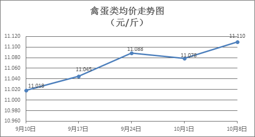 禽蛋類商品價(jià)格窄幅盤升。上周所監(jiān)測的6種禽蛋類商品價(jià)格波動情況為4漲1跌1平,綜合零售均價(jià)為11.110元/斤,環(huán)比上漲0.29%。其中:白條雞、白條鴨零售均價(jià)分別為每斤19.79元、15.58元,環(huán)比分別上漲0.30%、下降1.27%;白殼雞蛋、鴨蛋零售均價(jià)分別為每斤7.05元、8.14元,環(huán)比分別上漲1.59%、上漲2.01%。