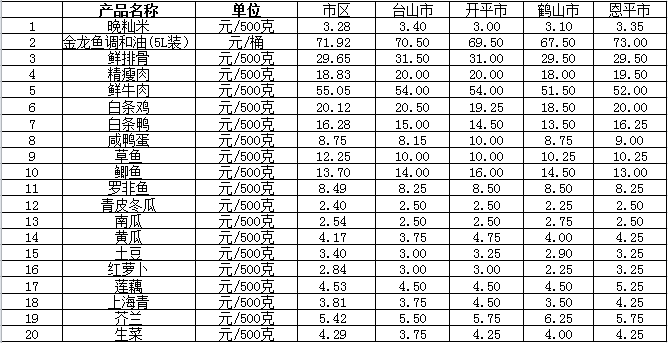 說明:1、表中價格為該地區(qū)監(jiān)測點綜合平均價;2、“市區(qū)”含蓬江區(qū)、江海區(qū)、新會區(qū),價格分別采自蓬江市場、江南市場、城東市場等13家農貿市場;3、其他四個縣市價格分別采自新華市場、錦江市場等8家農貿市場。