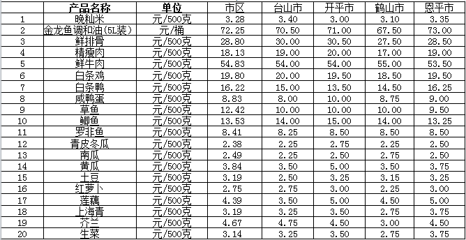 說(shuō)明:1、表中價(jià)格為該地區(qū)監(jiān)測(cè)點(diǎn)綜合平均價(jià);2、“市區(qū)”含蓬江區(qū)、江海區(qū)、新會(huì)區(qū),價(jià)格分別采自蓬江市場(chǎng)、江南市場(chǎng)、城東市場(chǎng)等13家農(nóng)貿(mào)市場(chǎng);3、其他四個(gè)縣市價(jià)格分別采自新華市場(chǎng)、錦江市場(chǎng)等8家農(nóng)貿(mào)市場(chǎng)。