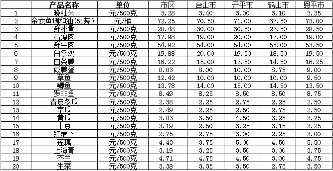 說明:1、表中價格為該地區(qū)監(jiān)測點綜合平均價;2、“市區(qū)”含蓬江區(qū)、江海區(qū)、新會區(qū),價格分別采自蓬江市場、江南市場、城東市場等13家農(nóng)貿(mào)市場;3、其他四個縣市價格分別采自新華市場、錦江市場等8家農(nóng)貿(mào)市場。