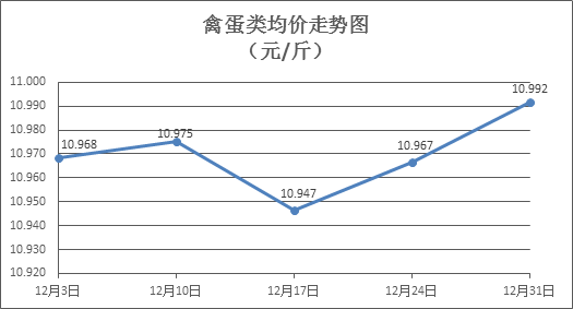 家禽類商品價(jià)格小幅上漲。上周所監(jiān)測(cè)的6種禽蛋類商品價(jià)格波動(dòng)情況為2漲1跌3平,綜合零售均價(jià)為10.992元/斤,環(huán)比上漲0.23%。其中:白條雞、白條鴨零售均價(jià)分別為每斤19.85元、15.44元,環(huán)比分別上漲0.81%、上漲0.19%;白殼雞蛋、鴨蛋零售均價(jià)分別為每斤6.77元、7.98元,環(huán)比分別持平、下降0.50%。