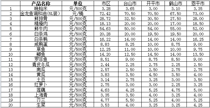 說(shuō)明:1、表中價(jià)格為該地區(qū)監(jiān)測(cè)點(diǎn)綜合平均價(jià);2、“市區(qū)”含蓬江區(qū)、江海區(qū)、新會(huì)區(qū),價(jià)格分別采自蓬江市場(chǎng)、江南市場(chǎng)、城東市場(chǎng)等13家農(nóng)貿(mào)市場(chǎng);3、其他四個(gè)縣市價(jià)格分別采自新華市場(chǎng)、錦江市場(chǎng)等8家農(nóng)貿(mào)市場(chǎng)。