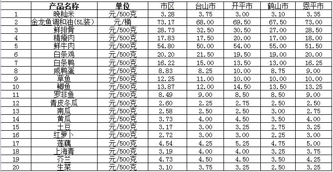 說明:1、表中價(jià)格為該地區(qū)監(jiān)測點(diǎn)綜合平均價(jià);2、“市區(qū)”含蓬江區(qū)、江海區(qū)、新會(huì)區(qū),價(jià)格分別采自蓬江市場、江南市場、城東市場等13家農(nóng)貿(mào)市場;3、其他四個(gè)縣市價(jià)格分別采自新華市場、錦江市場等8家農(nóng)貿(mào)市場。