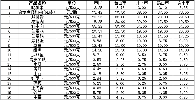 說明:1、表中價(jià)格為該地區(qū)監(jiān)測(cè)點(diǎn)綜合平均價(jià);2、“市區(qū)”含蓬江區(qū)、江海區(qū)、新會(huì)區(qū),價(jià)格分別采自蓬江市場(chǎng)、江南市場(chǎng)、城東市場(chǎng)等13家農(nóng)貿(mào)市場(chǎng);3、其他四個(gè)縣市價(jià)格分別采自新華市場(chǎng)、錦江市場(chǎng)等8家農(nóng)貿(mào)市場(chǎng)。
