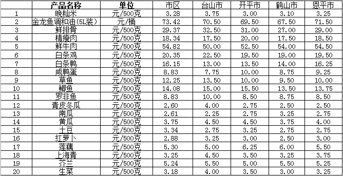 說明:1、表中價格為該地區(qū)監(jiān)測點綜合平均價;2、“市區(qū)”含蓬江區(qū)、江海區(qū)、新會區(qū),價格分別采自蓬江市場、江南市場、城東市場等13家農(nóng)貿(mào)市場;3、其他四個縣市價格分別采自新華市場、錦江市場等8家農(nóng)貿(mào)市場。