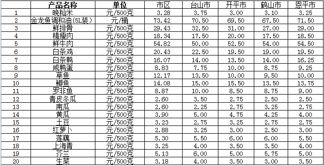 說(shuō)明:1、表中價(jià)格為該地區(qū)監(jiān)測(cè)點(diǎn)綜合平均價(jià);2、“市區(qū)”含蓬江區(qū)、江海區(qū)、新會(huì)區(qū),價(jià)格分別采自蓬江市場(chǎng)、江南市場(chǎng)、城東市場(chǎng)等13家農(nóng)貿(mào)市場(chǎng);3、其他四個(gè)縣市價(jià)格分別采自新華市場(chǎng)、錦江市場(chǎng)等8家農(nóng)貿(mào)市場(chǎng)。