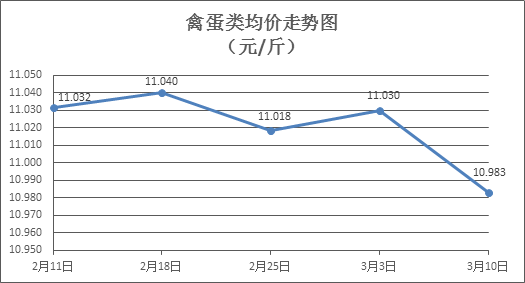 禽蛋類商品價(jià)格略有下降。上周所監(jiān)測(cè)的6種禽蛋類商品價(jià)格波動(dòng)情況為1漲3跌2平,綜合零售均價(jià)為10.983元/斤,環(huán)比下降0.42%。其中:白條雞、白條鴨零售均價(jià)分別為每斤20.29元、15.06元,環(huán)比分別下降0.59%、下降0.79%;白殼雞蛋、鴨蛋零售均價(jià)分別為每斤6.58元、7.69元,環(huán)比分別下降0.75%、持平。