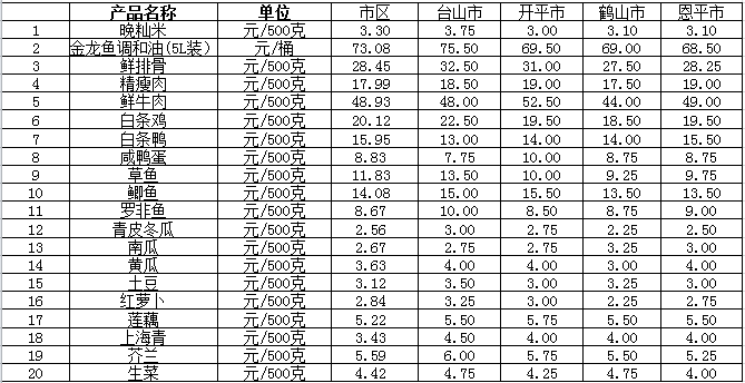 說(shuō)明:1、表中價(jià)格為該地區(qū)監(jiān)測(cè)點(diǎn)綜合平均價(jià);2、“市區(qū)”含蓬江區(qū)、江海區(qū)、新會(huì)區(qū),價(jià)格分別采自蓬江市場(chǎng)、江南市場(chǎng)、城東市場(chǎng)等13家農(nóng)貿(mào)市場(chǎng);3、其他四個(gè)縣市價(jià)格分別采自新華市場(chǎng)、錦江市場(chǎng)等8家農(nóng)貿(mào)市場(chǎng)。