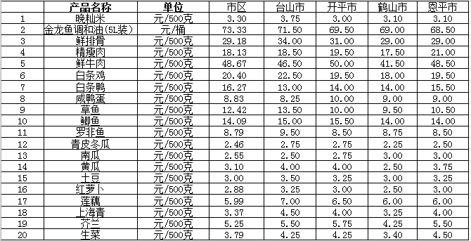 說明:1、表中價(jià)格為該地區(qū)監(jiān)測(cè)點(diǎn)綜合平均價(jià);2、“市區(qū)”含蓬江區(qū)、江海區(qū)、新會(huì)區(qū),價(jià)格分別采自蓬江市場(chǎng)、江南市場(chǎng)、城東市場(chǎng)等13家農(nóng)貿(mào)市場(chǎng);3、其他四個(gè)縣市價(jià)格分別采自新華市場(chǎng)、錦江市場(chǎng)等8家農(nóng)貿(mào)市場(chǎng)。
