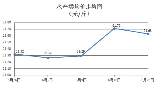 水產(chǎn)類商品價格漲跌互現(xiàn)。所監(jiān)測的10種水產(chǎn)商品價格波動情況為4漲5跌1平,綜合均價為每斤21.63元,環(huán)比下降0.36%。其中:草魚、鯽魚、鱸魚、羅非魚、基圍蝦零售均價分別為每斤11.09元、14.31元、21.10元、8.85元、30.61元,環(huán)比分別下降3.73%、下降0.62%、上漲2.38%、上漲0.57%、下降1.70%。