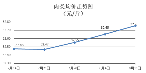 肉類商品價(jià)格總體略漲。所監(jiān)測的8種肉類商品價(jià)格波動情況為5漲3跌,綜合零售均價(jià)為每斤32.76元,環(huán)比上漲0.31%。其中:排骨、精瘦肉、牛肉、帶骨羊肉零售均價(jià)分別為每斤32.22元、19.81元、45.42元、43.35元,環(huán)比分別上漲1.23%、上漲1.02%、下降0.31%、下降0.05%?! ?/p>
