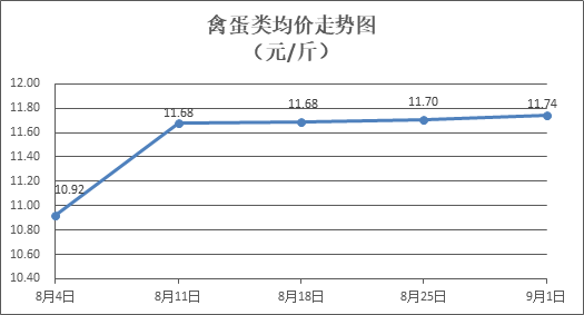 禽蛋類商品價(jià)格穩(wěn)中略漲。所監(jiān)測(cè)的5種禽蛋類商品價(jià)格波動(dòng)情況為4漲1平,綜合零售均價(jià)為每斤11.74元,環(huán)比上漲0.32%。其中:白條雞、白條鴨零售均價(jià)分別為每斤20.09元、15.32元,環(huán)比分別上漲0.20%、上漲0.52%;白殼雞蛋、鴨蛋零售均價(jià)分別為每斤6.52元、7.73元,環(huán)比分別持平、上漲0.39%。