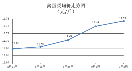 禽蛋類商品價(jià)格微幅上漲。所監(jiān)測(cè)的5種禽蛋類商品價(jià)格波動(dòng)情況為4漲1跌,綜合零售均價(jià)為每斤11.75元,環(huán)比上漲0.12%。其中:白條雞、白條鴨零售均價(jià)分別為每斤20.10元、15.36元,環(huán)比分別上漲0.05%、上漲0.26%;白殼雞蛋、鴨蛋零售均價(jià)分別為每斤6.49元、7.75元,環(huán)比分別下降0.46%、上漲0.26%。
