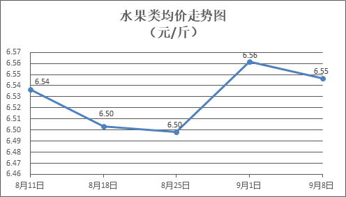 水果類商品價(jià)格窄幅盤整。所監(jiān)測(cè)的6種水果商品價(jià)格波動(dòng)情況為3漲3跌,綜合零售均價(jià)為每斤6.55元,環(huán)比下降0.23%。其中橙子、蘋果、梨零售均價(jià)分別為每斤6.05元、7.48元、5.71元,環(huán)比分別上漲1.68%、下降0.66%、下降0.17%。