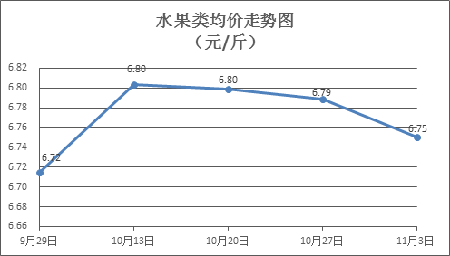 水果類(lèi)商品價(jià)格有所下降。所監(jiān)測(cè)的6種水果商品價(jià)格波動(dòng)情況為2漲4跌,綜合零售均價(jià)為每斤6.75元,環(huán)比下降0.60%。其中橙子、蘋(píng)果、葡萄零售均價(jià)分別為每斤6.67元、7.42元、13.49元,環(huán)比分別下降0.55%、下降0.35%、上漲1.32%。