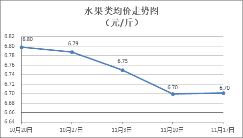 水果類商品價(jià)格升降互現(xiàn)。所監(jiān)測的6種水果商品價(jià)格波動(dòng)情況為2漲3跌1平,綜合零售均價(jià)為每斤6.70元,環(huán)比上漲0.02%。其中橙子、蘋果、葡萄零售均價(jià)分別為每斤6.32元、7.43元、13.78元,環(huán)比分別下降1.56%、下降0.27%、上漲1.62%。