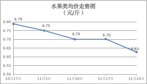 水果類商品價(jià)格普遍下降。所監(jiān)測(cè)的6種水果商品價(jià)格波動(dòng)情況為1漲5跌,綜合零售均價(jià)為每斤6.63元,環(huán)比下降1.12%。其中橙子、蘋果、葡萄零售均價(jià)分別為每斤6.14元、7.42元、13.44元,環(huán)比分別下降2.85%、下降0.13%、下降2.47%。