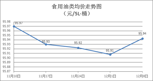 食用油類商品價(jià)格輕微上漲。所監(jiān)測(cè)的9種食用油(5L裝)商品價(jià)格波動(dòng)情況為6漲1跌2平,綜合零售均價(jià)為每桶95.94元,環(huán)比上漲0.04%。其中:金龍魚(yú)花生油、大豆油零售均價(jià)為每桶102.90元、62.48元,環(huán)比分別上漲0.19%、上漲0.03%。