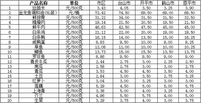 說(shuō)明:1、表中價(jià)格為該地區(qū)監(jiān)測(cè)點(diǎn)綜合平均價(jià);2、“市區(qū)”含蓬江區(qū)、江海區(qū)、新會(huì)區(qū),價(jià)格分別采自蓬江市場(chǎng)、江南市場(chǎng)、城東市場(chǎng)等13家農(nóng)貿(mào)市場(chǎng);3、其他四個(gè)縣市價(jià)格分別采自新華市場(chǎng)、錦江市場(chǎng)等8家農(nóng)貿(mào)市場(chǎng)。