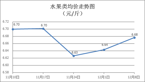 水果類商品價(jià)格小幅波動(dòng)。所監(jiān)測(cè)的6種水果商品價(jià)格波動(dòng)情況為3漲2跌1平,綜合零售均價(jià)為每斤6.68元,環(huán)比上漲0.50%。其中橙子、蘋(píng)果、葡萄零售均價(jià)分別為每斤6.04元、7.45元、13.78元,環(huán)比分別下降1.47%、上漲0.27%、上漲2.00%。