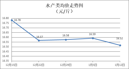 水產(chǎn)類商品價格窄幅盤整。所監(jiān)測的9種水產(chǎn)商品價格波動情況為3漲5跌1平,綜合均價為每斤16.52元,環(huán)比下降0.44%。其中:草魚、鯽魚、羅非魚、鳙魚、基圍蝦零售均價分別為每斤10.86元、14.15元、9.04元、10.50元、29.43元,環(huán)比分別下降1.45%、上漲0.86%、下降0.55%、下降1.59%、下降1.14%。