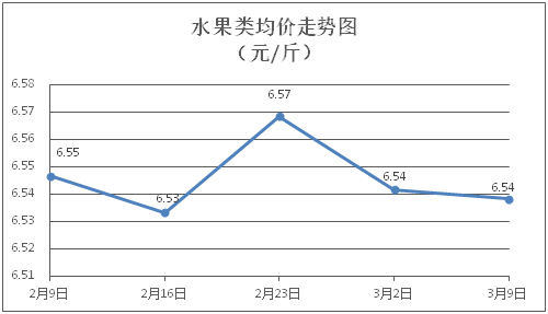 水果類商品價(jià)格弱勢(shì)盤整。所監(jiān)測(cè)的6種水果商品價(jià)格波動(dòng)情況為2漲1跌3平,綜合零售均價(jià)為每斤6.54元,環(huán)比下降0.05%。其中橙子、香蕉、葡萄零售均價(jià)分別為每斤5.97元、3.17元、13.68元,環(huán)比分別上漲0.17%、上漲0.63%、下降0.36%。