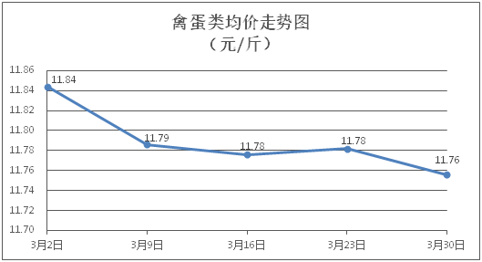 禽蛋類商品價格窄幅盤整。所監(jiān)測的5種禽蛋類商品價格波動情況為1漲3跌1平,綜合零售均價為每斤11.76元,環(huán)比下降0.22%。其中:白條雞、白條鴨零售均價分別為每斤20.55元、15.16元,環(huán)比分別下降0.15%、下降0.52%;雞蛋、鴨蛋零售均價分別為每斤6.32元、7.57元,環(huán)比分別下降0.63%、持平。