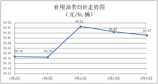 食用油類商品價格穩(wěn)中微降。所監(jiān)測的9種食用油(5L裝)商品價格波動情況為4跌5平,綜合零售均價為每桶96.47元,環(huán)比下降0.01%。其中:魯花花生油、金龍魚調(diào)和油零售均價為每桶155.83元、72.04元,環(huán)比分別持平、下降0.04%。
